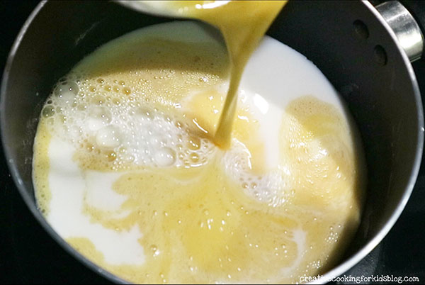 • ตั้งหม้อบนเตา ใส่นมสดและน้ำตาลทราย 2 ช้อนโต๊ะ