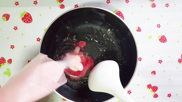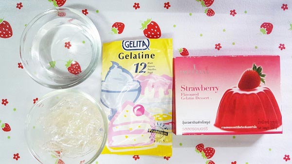 • นำน้ำเปล่า เจลาตินและผงเจลาตินรสที่ชอบ เทรวมกัน คนจนเข้ากันและนำตั้งบนไฟอ่อน 5-10 นาที
