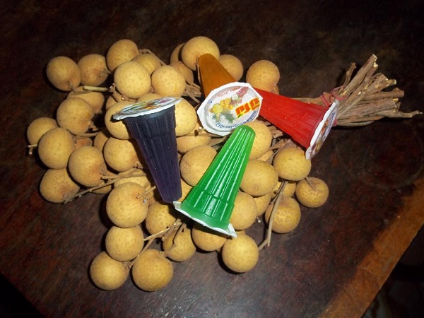 3.ตักปีโป้ที่ละลายเป็นน้ำแล้วใส่ลงในลำไยเราเตรียมไว้ (ขอย้ำว่ารีบ ๆ ตักเลยนะคะ เพราะปีโป้จะแข็งตัวเร็วมาก)