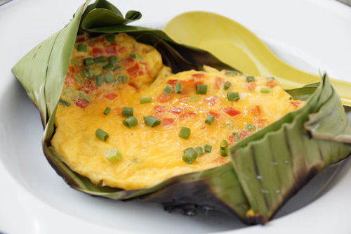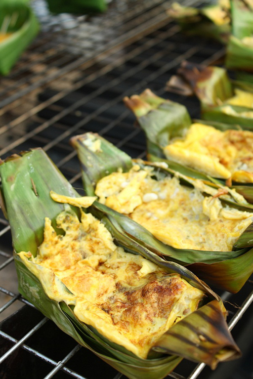 1. ตีผสมไข่ไก่กับเกลือป่น และพริกไทยป่นพอเข้ากัน จากนั้นเทลงในกระทงใบตองประมาณ 1/2 ของกระทง