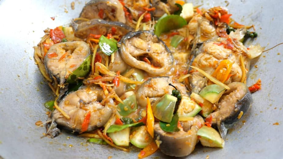 - เมื่อทุกอย่างเข้ากันดีแล้ว ใส่มะเขือที่ เราแช่น้ำเกลือไว้ หลังจากนั้นผัดให้เข้ากันอีกครั้ง หลังจากนั้นใส่ปลาดุกที่เราต้มไว้แล้ว แล้วค่อยๆ คนเอาเครื่องผัดฉ่ามาคลุกกับเนื้อปลาให้เข้ากันดี หลังจากนั้นเติมความหอมด้วยโหระพา ก็เป็นอันเสร็จเรียบร้อย