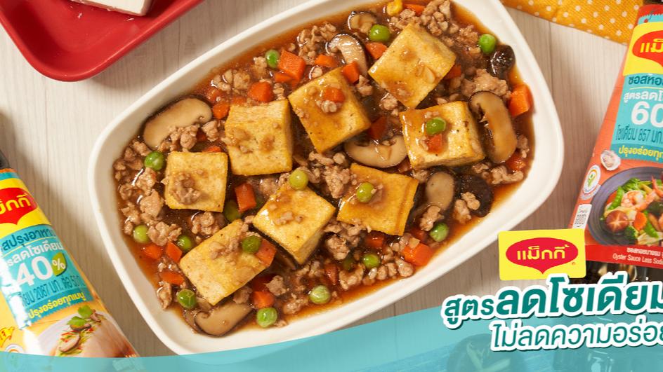 2. ใส่กระเทียมผัดให้พอหอม ตามด้วยหมูบดผัดพอสุกจึงใส่เห็ดหอม และผักสามสี ผัดให้เข้ากัน ปรุงรสด้วยซอสหอยนางรมแม็กกี้ สูตรลดโซเดียม และซอสปรุงอาหารแม็กกี้ สูตรลดโซเดียม พริกไทยขาว และน้ำตาล ผัดให้เข้ากัน ผสมแป้งมันหรือแป้งข้าวโพดกับน้ำ คนให้ละลาย ใส่ซีอิ้วดำ เคี่ยวให้ซอสข้น โรยต้นหอมซอย ปิดไฟ