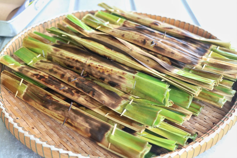 จากแล้ว จะอยู่ตัว ไม่ไหล ตักใส่ใบจากที่เตรียมไว้ หุ้มปลายเข้าหากันและกลัดไว้ด้วยไม้กลัดหรือแม็ค