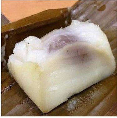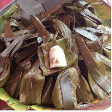 5.ใส่ในใบตองและตักส่วนหน้าขนมใส่ประมาณ 2 -3 ช้อนชา แล้วห่อเป็นทรงสูง คาดด้วยทางมะพร้าวและกลัดด้วยไม้กลัด