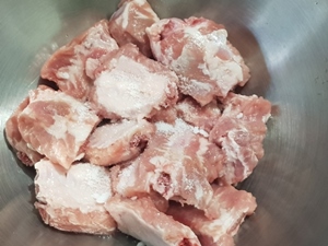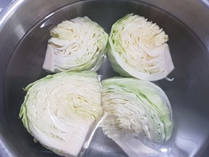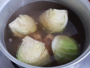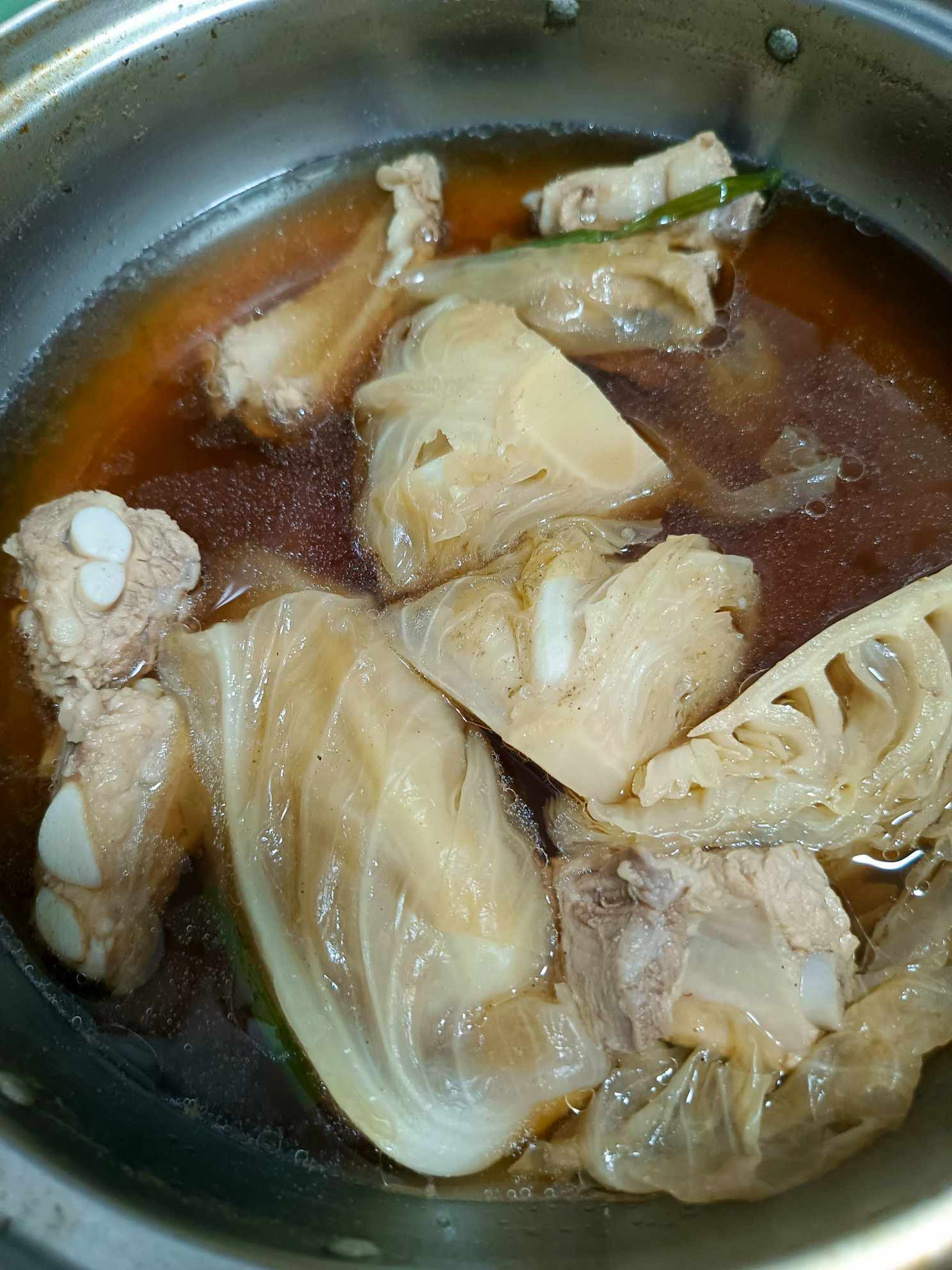 1.ผักกะหล่ำปลี แบ่งเป็น 4 ชิ้น ล้างให้สะอาด กระดูกหมูล้างให้สะอาด พักไว้
