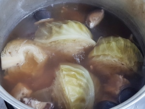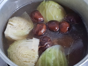 ลดเป็นไฟอ่อน ใส่กระหล่ำปลี และเห็ดหอม ต้มตุ้นต่อจนน้ำซุปหวาน หมูและผักสุกนุ่ม