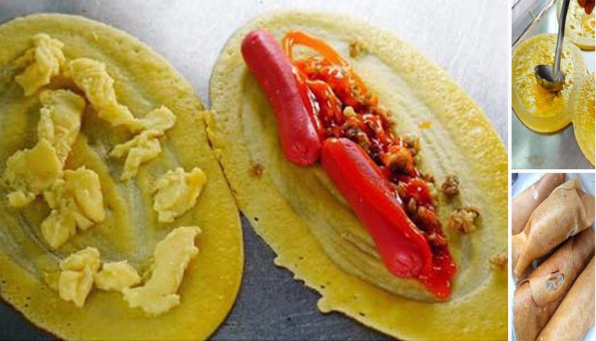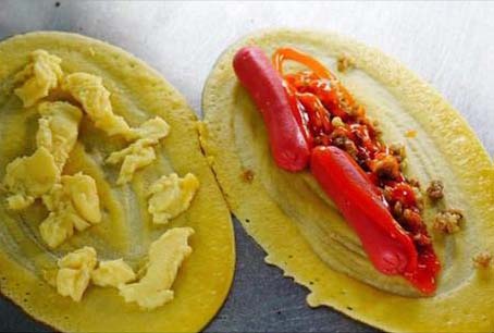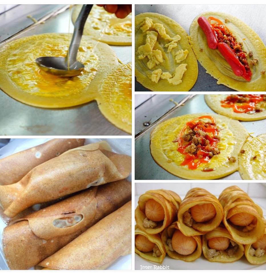 2. หากเป็นไส้ไข่นกกระทา ให้ตอกไข่ลงบนแป้ง เมื่อแป้งและไข่สุกใส่หมูบดลงไปเล็กน้อย โรยพริกป่น แต่ถ้าเป็นไส้ครีมและไส้ไส้กรอก เมื่อแป้งสุกจึงตักไส้ใส่ลงไป