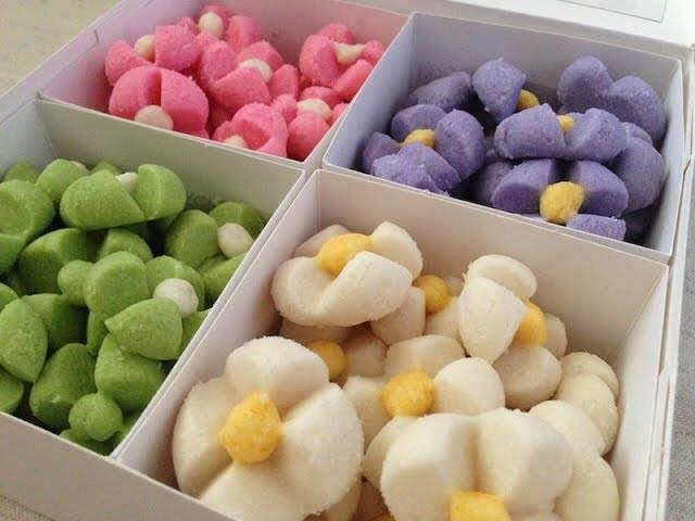 3. ปั้นแป้งเป็นลูกกลม ๆ จากนั้นใช้มีดคม ๆ แบ่งแป้งเป็น 4 ส่วน จับวางให้เป็นกลีบ 3 กลีบ ส่วนแป้งอีก 1 ส่วนที่เหลือให้ปั้นเป็นลูกกลม ๆ กดเบา ๆ วางลงตรงกลางกลีบ จากนั้นเรียงในถาด เตรียมไว้