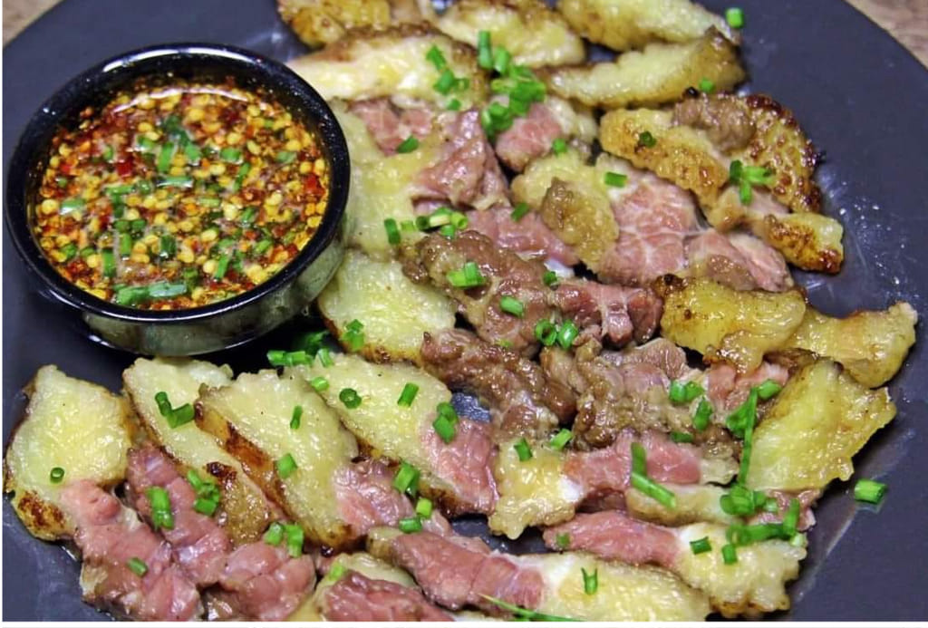 6.ใช้มีดหั่นเนื้อเสือร้องไห้เป็นชิ้น ๆ ตักเสิร์ฟใส่จาน พร้อมน้ำจิ้มแจ่ว เป็นอันเสร็จ