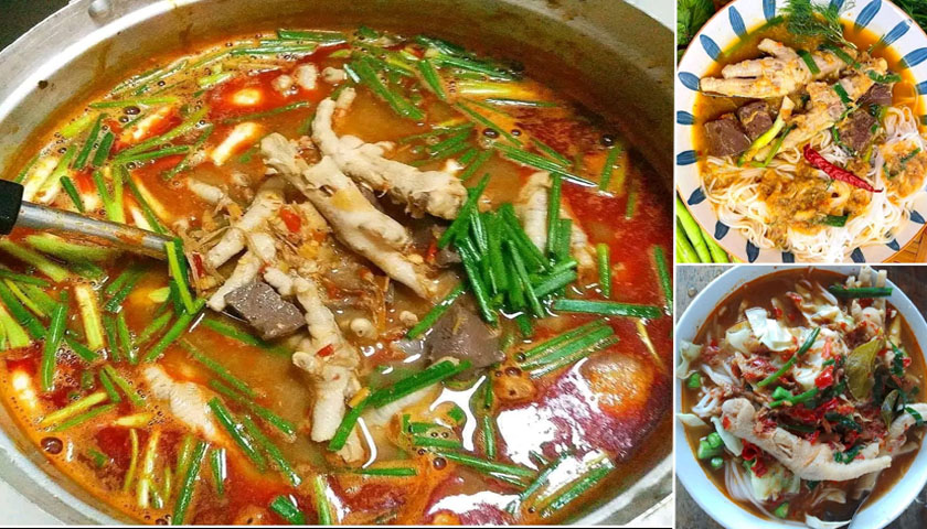 6.ชิมรส ใส่เลือดไก่ ใบมะกรูดฉีกผักชีลาว พริกสดลงไป แล้วต้นหอมโรยหน้าและปิดไฟได้เลย เป็นอันเสร็จพิธี