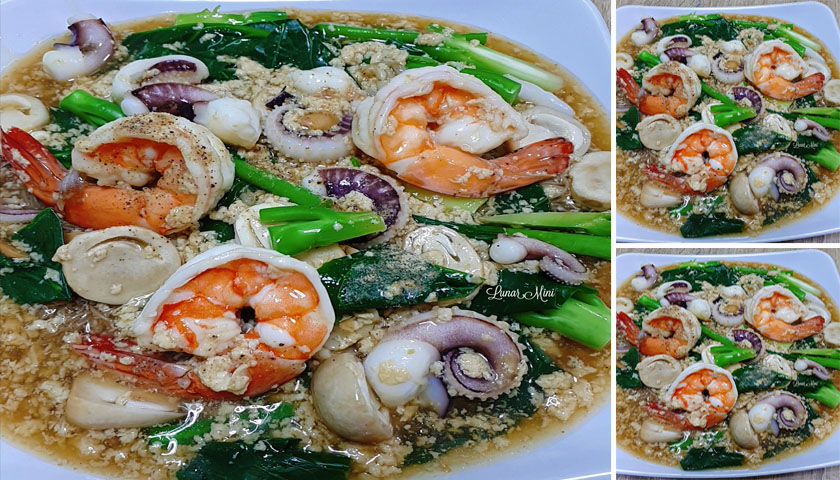 2.จากนั้นใส่น้ำซุปหรือน้ำเปล่าตามลงไปสัก 1 แก้ว รอจนน้ำซุปเดือด จึงเทเครื่องทะเลที่หมักไว้ลงตามปล่อยน้ำซุปให้เดือดจนหมึกกุ้งหอยสุก น้ำหมักก็จะเซ็ตตัว ตัวจับกันเป็นลิ่มๆ เพราะในน้ำหมักมีไข่ที่หมักผสมไว้ จึงทำให้น้ำราดหน้ามีความข้นเป็นลิ่มน่ากิน