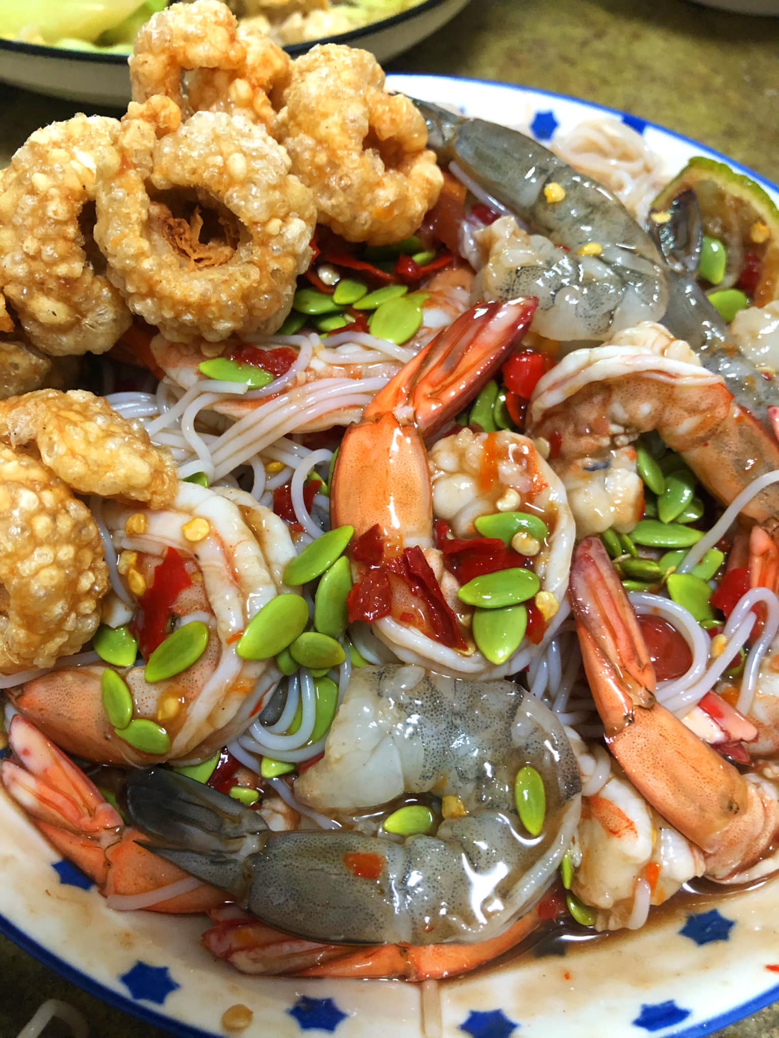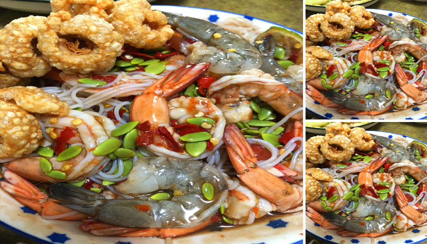 3. หอยแมลงภู่นิวซีแลนด์ลวก ปลาหมึกลวก และกุ้งสด จากนั้นก็ใช้ทัพพีคลุกให้เข้ากับน้ำส้มตำ
