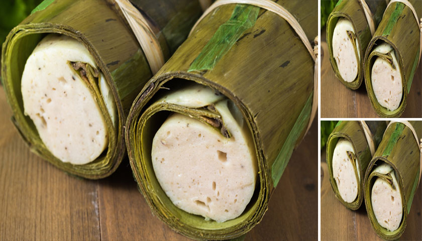 4. ตักส่วนผสมลงไปแล้วม้วนใบตองให้เป็นแนวยาว จากนั้นก็มัดด้วยเชือกให้แน่น