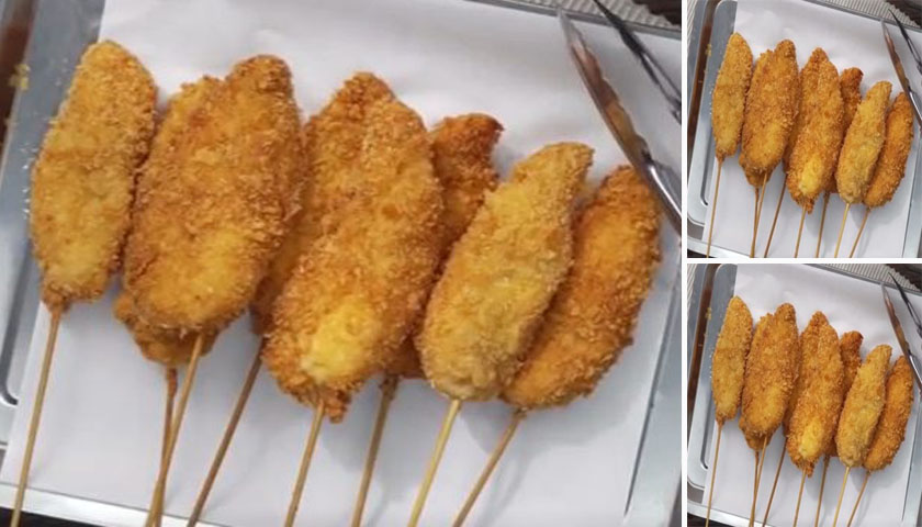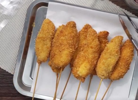 - จากนั้นก็นำไม้มาเสียบเนื้อไก่แล้วนำไปชุบแป้งทอดกรอบ ไข่ไก่ เกล็ดขนมปัง ตามลำดับ