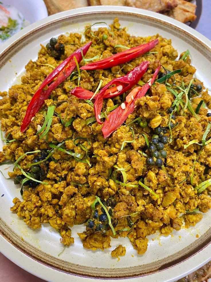 2. ตามด้วยหมูบดและพริกแกงคั่วกลิ้ง