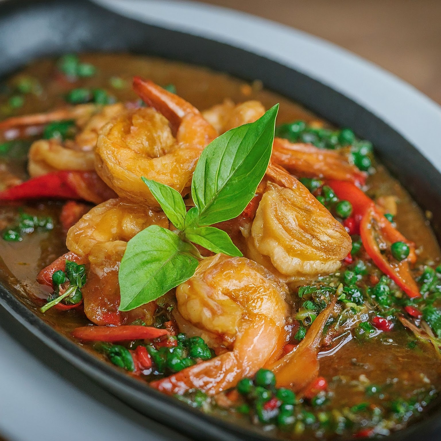 3.ปรุงรสด้วยน้ำปลา, น้ำตาล และน้ำมันหอย เร่งไฟให้แรงขึ้น ใส่กระชาย, พริกชี้ฟ้าหั่นแฉลบ, ใบโหระพา, ใบมะกรูด, พริกไทยอ่อนและน้ำซุป ผัดอย่างรวดเร็วจนส่วนผสมทุกอย่างเข้ากันดี จึงปิดไฟ ตักใส่จาน เสริฟทันทีพร้อมข้าวสวยร้อนๆ