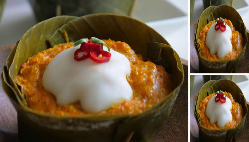 10. เมื่อห่อหมกครบเวลา 20 นาทีแล้ว หยอดหัวกะทิลงไปบนหน้าห่อหมก ตกแต่งด้วยพริกชี้ฟ้าแดงซอยและใบมะกรูดหั่นฝอย