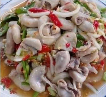 2.นำไส้มาหั่นเป็นชิ้นพอคำ ตำพริกกระเทียม หั่นหอมหัวใหญ่ มะเขือเทศลงไป ปรุงรสด้วยน้ำปลา น้ำมะนาว ซีอิ๋วขาว ผงปรุงคอนร์