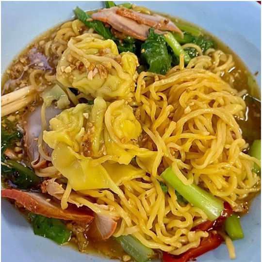 – วางบะหมี่ไข่ในชามเสิร์ฟ ใส่เกี๊ยวหมูและหมูแดงที่เตรียมไว้ ใส่ผักกวางตุ้งลวกลงในชาม