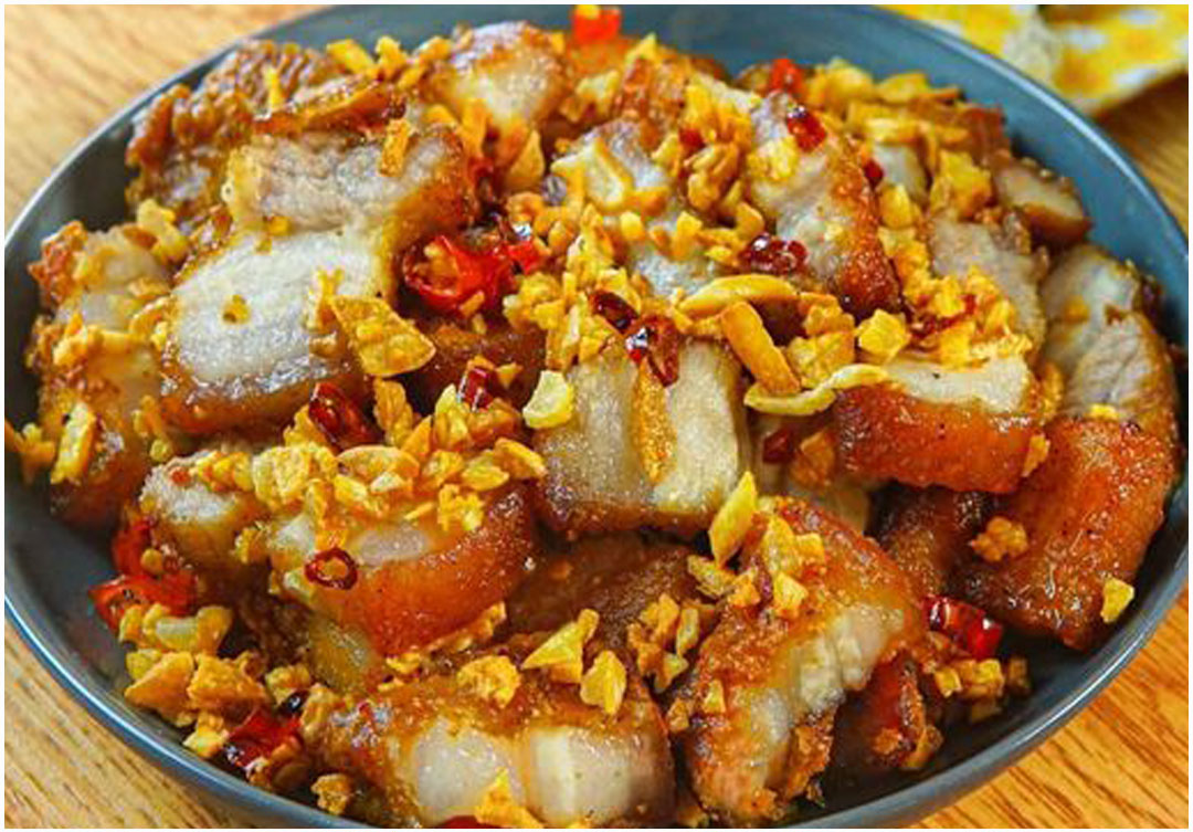 4. ใส่หมูสามชั้นทอดลงในกระทะ คั่วกับพริกและเกลือจนเข้ากันดี ชิมรสแล้วปรับเพิ่มเกลือหรือน้ำปลาได้ตามชอบ