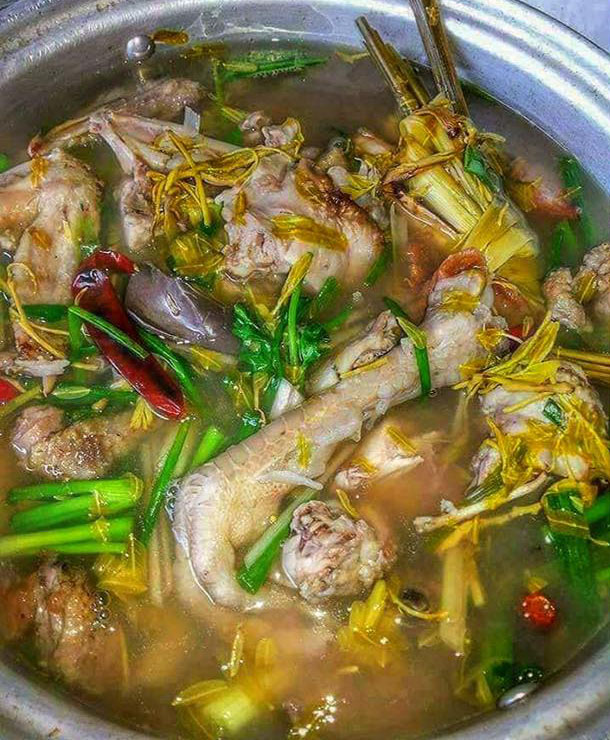 ****ตั้งหม้อใส่น้ำประมาณ 1 ลิตร ใส่เกลือ 1 ช้อนโต๊ะ เมื่อน้ำเริ่มเดือดใส่พริก หอมแดง ข่า ตะไคร้ พอน้ำเดือดอีกครั้งใส่เนื้อไก่ที่สับไว้ลงไป (ห้ามคน เดี๋ยวจะคาว) ตามด้วยใบมะขามอ่อน รอจนน้ำเดือดอีกครั้งปรุงรสด้วยน้าปลา น้ำมะขามเปียก ให้ชิมดูให้ออกรสเปรี้ยวนำ เค็มตาม เติมผักหอมเปหรือยี่หร่า ต้นหอม ยกลง (สำหรับตับไก่ ไส้ไก่ นำมาทำความสะอาด เยาะเกลือนิดหน่อย นำไปปิ้งแห้ง ๆ กินกับข้าวเหนียวอร่อยมาก)