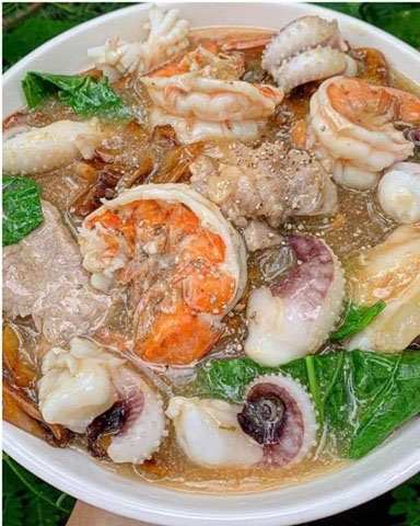 – จากนั้นใส่น้ำซุปหรือน้ำเปล่าตามลงไปสัก 1 แก้ว รอจนน้ำซุปเดือด จึงเทเครื่องทะเลที่หมักไว้ลงตามปล่อยน้ำซุปให้เดือดจนหมึกกุ้งหอยสุก น้ำหมักก็จะเซ็ตตัว ตัวจับกันเป็นลิ่มๆ เพราะในน้ำหมักมีไข่ที่หมักผสมไว้ จึงทำให้น้ำราดหน้ามีความข้นเป็นลิ่มน่ากิน