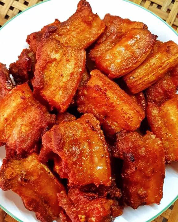 *นำหมูสามชั้นที่หมักไว้มาลงทอดในน้ำมันท่วมตัวหมูสามชั้น ใช้ไฟกลาง ทอดจนตัวหมูเริ่มเปลี่ยนเป็นสีน้ำตาล ตักขึ้นสะเด็ดน้ำมัน