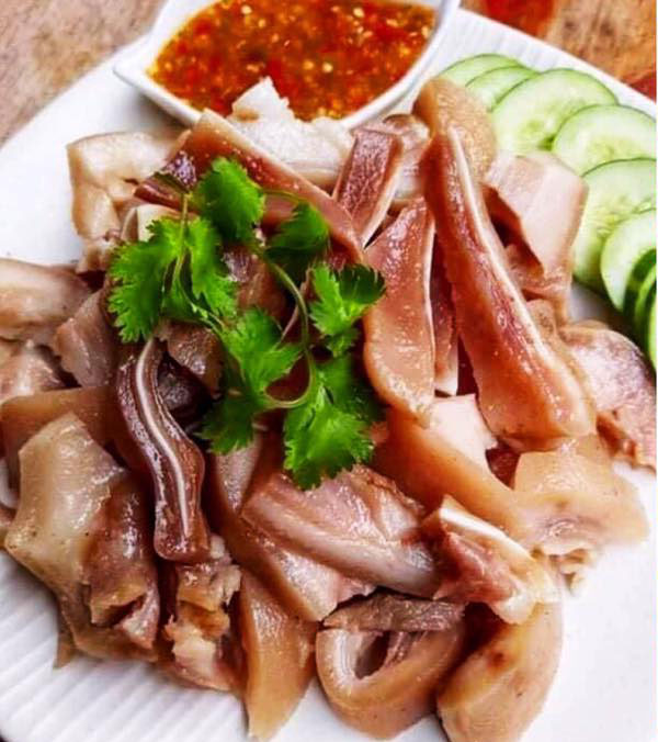 -เอาน้ำใส้หม้อ ใส่เกลือ ใส่กระเทียมทุบ ใส่ซีอิ้วดำ น้ำเดือดใส่หูหมูต้มจนเปื่อยตามต้องการหลังจากเปื่อยตามต้องการแล้วให้เอาขึ้นมาพักไว้ในตะแกรงทันที พอสะเด็ดน้ำแล้ว หั่นชิ้นพอคำใส่จาน