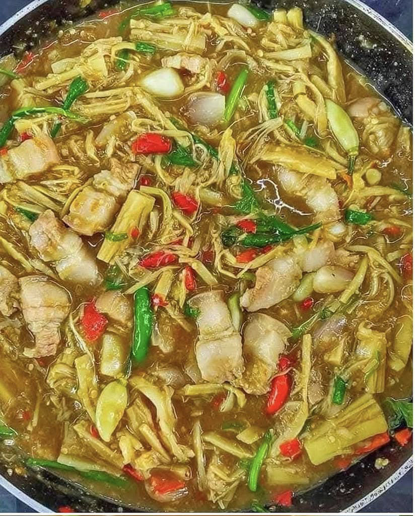 3นำหน่อไม้ต้ม หมูสามชั้น เครื่องเเกง ผัก น้ำย่านาง ข้าวเบื่อ เเละเครื่องปรุงรส ตามใจชอบ คลุกเคล้าให้เข้ากัน