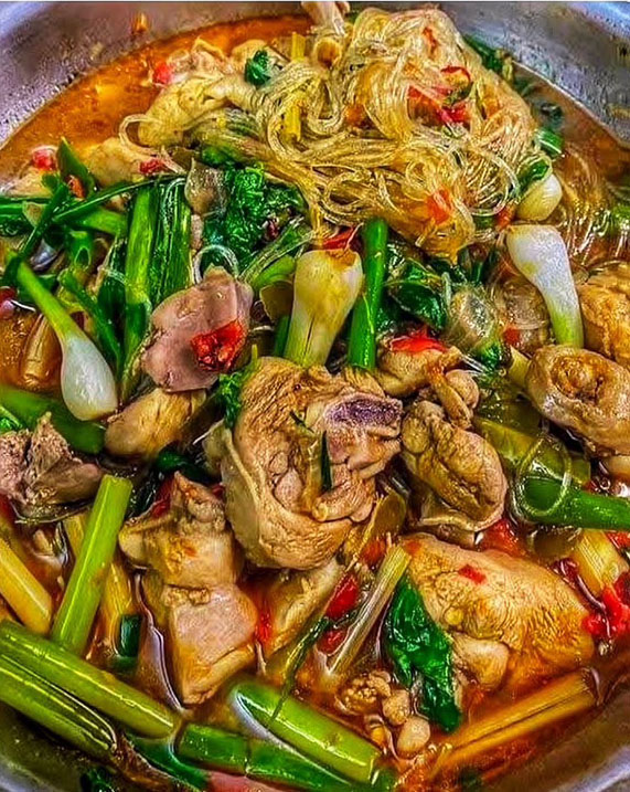 👉ใส่น้ำมัน ตามด้วยพริกแกงที่โขลกไว้ ผัดเล็กน้อยให้มีกลิ่นหอม หลังจากนั้นใส่ไก่ลงไป ปรุงรสด้วย เกลือ ผงชูรส น้ำปลาร้า คลุกเคล้าให้ส่วนผสมทั้งหมดเข้ากัน เติมน้ำเปล่าลงไป หลังจากนั้นใส่วุ้นเส้น ใบแมงลัก ต้นหอม ใบมะกรูด คลุกเคล้าอีกรอบให้ส่วนผสมเข้ากัน เป็นอันเสร็จเรียบร้อยแล้วจ้ะ