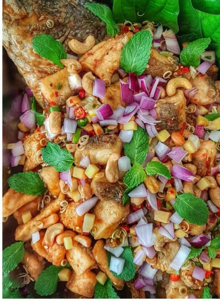 6.เสร็จแล้วนำมาตักราดลงบนตัวปลาทอด ตกแต่งด้วยใบสะระแหน่ ก็เป็นอันเสร็จพร้อมเสิร์ฟ