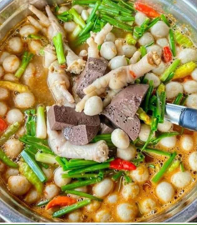 นำตะไตร้ กระชาย ข่า ใบมะกรูด หอมเเดง เเละพริกเเห้งลงต้มในหม้อ นำปลา เเละตีนไก่ ลงต้มให้สุกนิ่ม