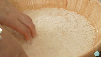 ◆ ซาวข้าวเหนียว 1-3 รอบหรือจนกว่าน้ำซาวจะใส จากนั้นแช่น้ำทิ้งไว้ 20-30 นาทีค่ะ