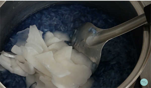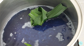 ◆ เทน้ำมะพร้าว 1/2 ส่วนลงในหม้อแล้วใช้ไฟปานกลางค่ะ จากนั้นใส่น้ำอัญชันลงไป ตามด้วยข้าวเหนียว