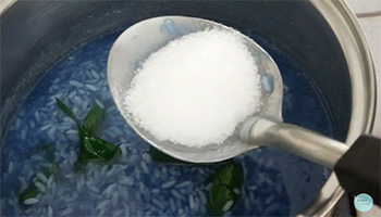 ◆ เมื่อข้าวเหนียวเริ่มสุกให้ใส่น้ำมะพร้าวที่เหลือลงไป ตามด้วยน้ำตาลทราย